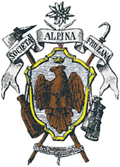 Il disegno del 1881 non è riferibile a un autore preciso; alcune ipotesi portano a Giovanni Masutti, che realizzò dei diplomi sezionali, o a Giovanni Del Puppo, che fece alcuni schizzi per il gruppo speleologico, oppure a qualche incisore della Litografia Passero, ai tempi fiorente attività di stampa in Udine. Inizialmente viene riprodotto solo in nero e il colore, quando usato, evidenzia l’elemento centrale della composizione: l’aquila. Dal 1900 si cominciano a vedere rappresentazioni colorate, fino ad arrivare alla versione attuale. (…) Da un’analisi superficiale potrebbe sembrare che l’attrezzatura alpinistica riprodotta non sia corretta. Invece lo stemma è perfetto per l’epoca in cui fu pensato e riporta gli elementi alpinistici classici del momento. La piccozza, a supporto dello lo scudo, integra i due principali attrezzi utilizzati dagli alpinisti nel 1800: bastone e accetta. Già nel 1864, sul primo volume del The Alpine Journal, si distingue la picca destinata all’uso della guida alpina, munita di ascia per intagliare gradini nel ghiaccio, da quella destinata al cliente, tronca dalla parte opposta alla becca, arrivando a definire i dettagli di costruzione di questo attrezzo. A destra dello stemma c’è il “bastone ferrato” qui identificato con il bastone da montagna, l’alpenstock o pistocco: dotato di punta metallica, era utilizzato per la progressione in montagna nonché per sondare il terreno su neve e ghiaccio. È lui il bastone che nell’Ottocento aiuta gli alpinisti sui terreni insidiosi insieme all’accetta, da legna o da carpenteria, con la quale si fonderà nella prima rudimentale piccozza.